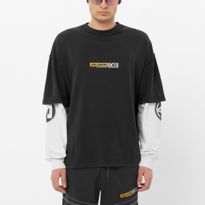 Salomon LS Tee Slam Jam は、本格的なマウンテンスポーツのテクノロジーをあらゆるシーンで手軽に楽しめるよう作られた一着。都会での着用はもちろん、寒い季節のアクティブな活動にも対応。Y2K SF 的世界、宇宙人、スノーボード黎明期のスターたちからインスパイアされたデザインが特徴です。