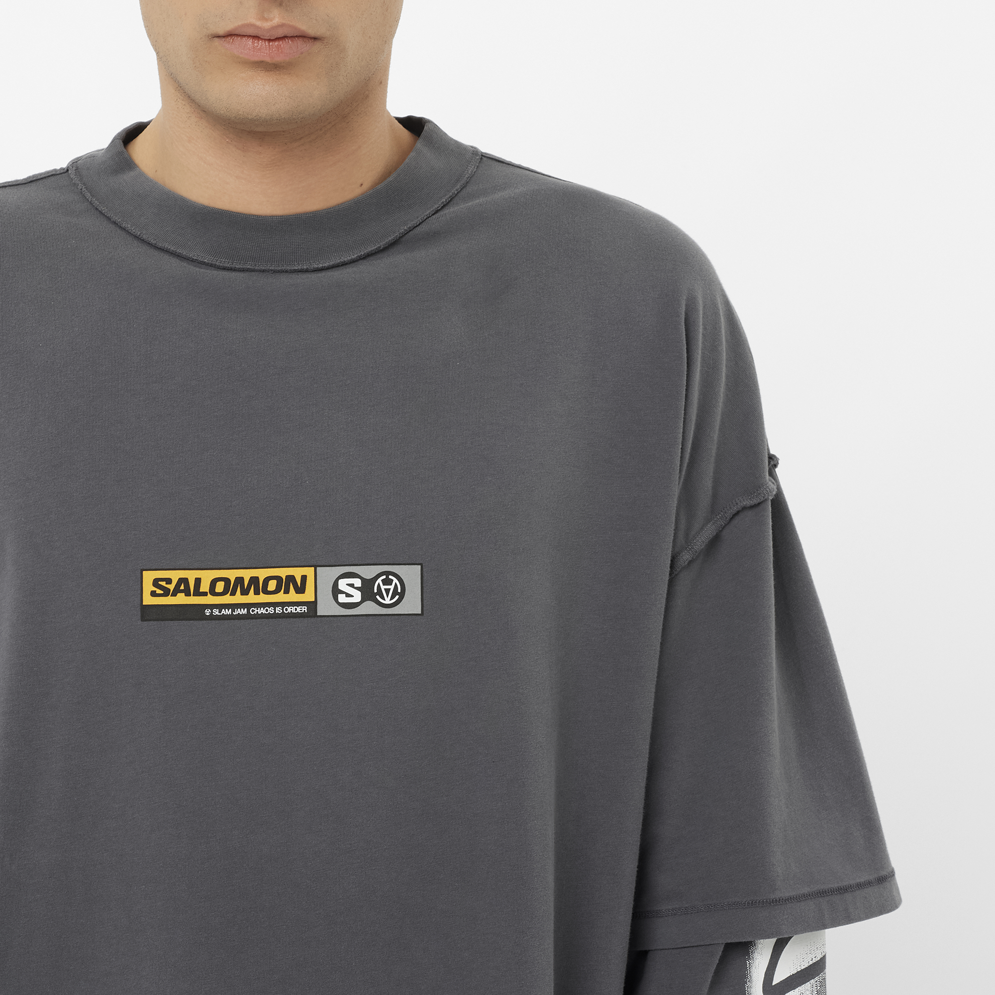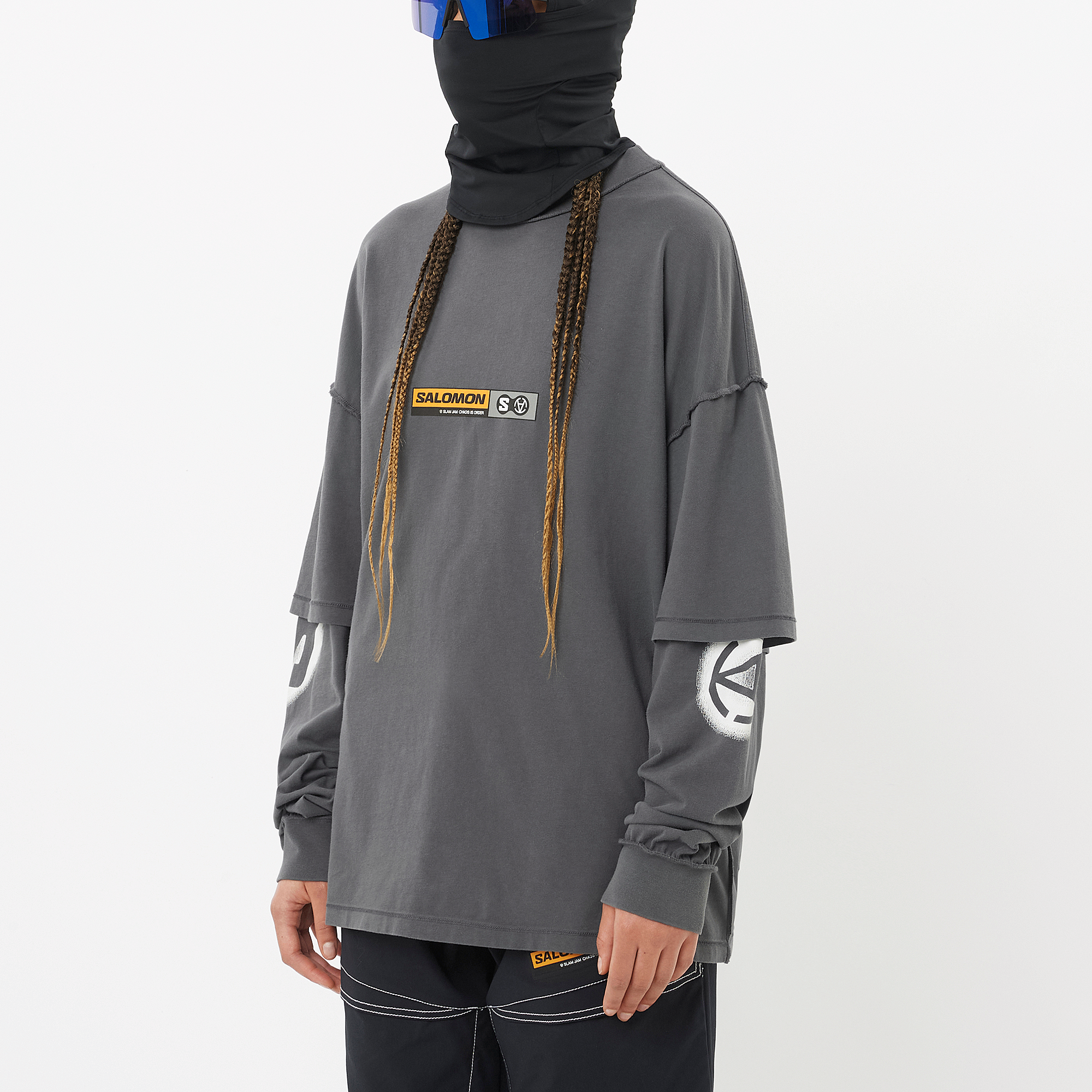 Salomon LS Tee Slam Jam は、本格的なマウンテンスポーツのテクノロジーをあらゆるシーンで手軽に楽しめるよう作られた一着。都会での着用はもちろん、寒い季節のアクティブな活動にも対応。Y2K SF 的世界、宇宙人、スノーボード黎明期のスターたちからインスパイアされたデザインが特徴です。